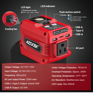 - 220W DC to AC Power Conversion: Converts 18V DC to 110V-120V AC, providing a reliable power source for phones, laptops, tablets, and other small electronics, making it essential for travel and power outages.