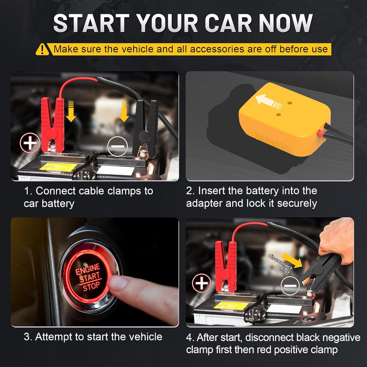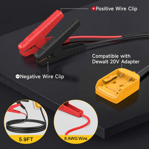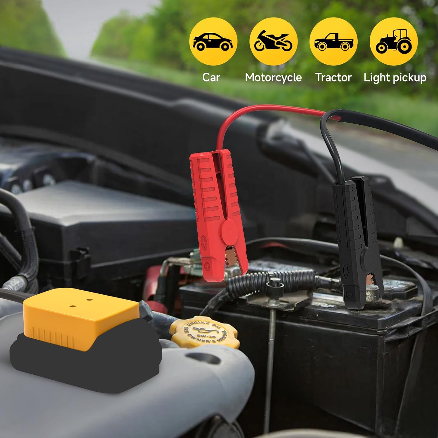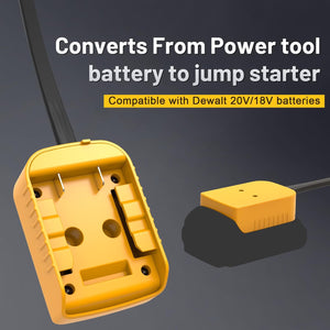 - Jumper Cable Clamps: The jump starter cable is designed to be compatible with DeWalt batteries. When your car battery drains and leaves you stranded, It may be difficult to find someone to help jump-start your car. Our jumper cables offer you a new solution, Only need to move the power adapter into the groove, Then push the converter and ensure it has locked the battery